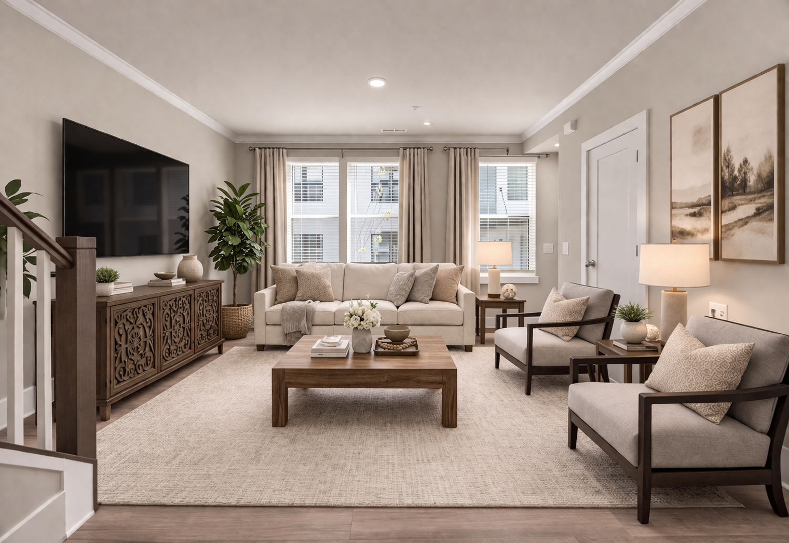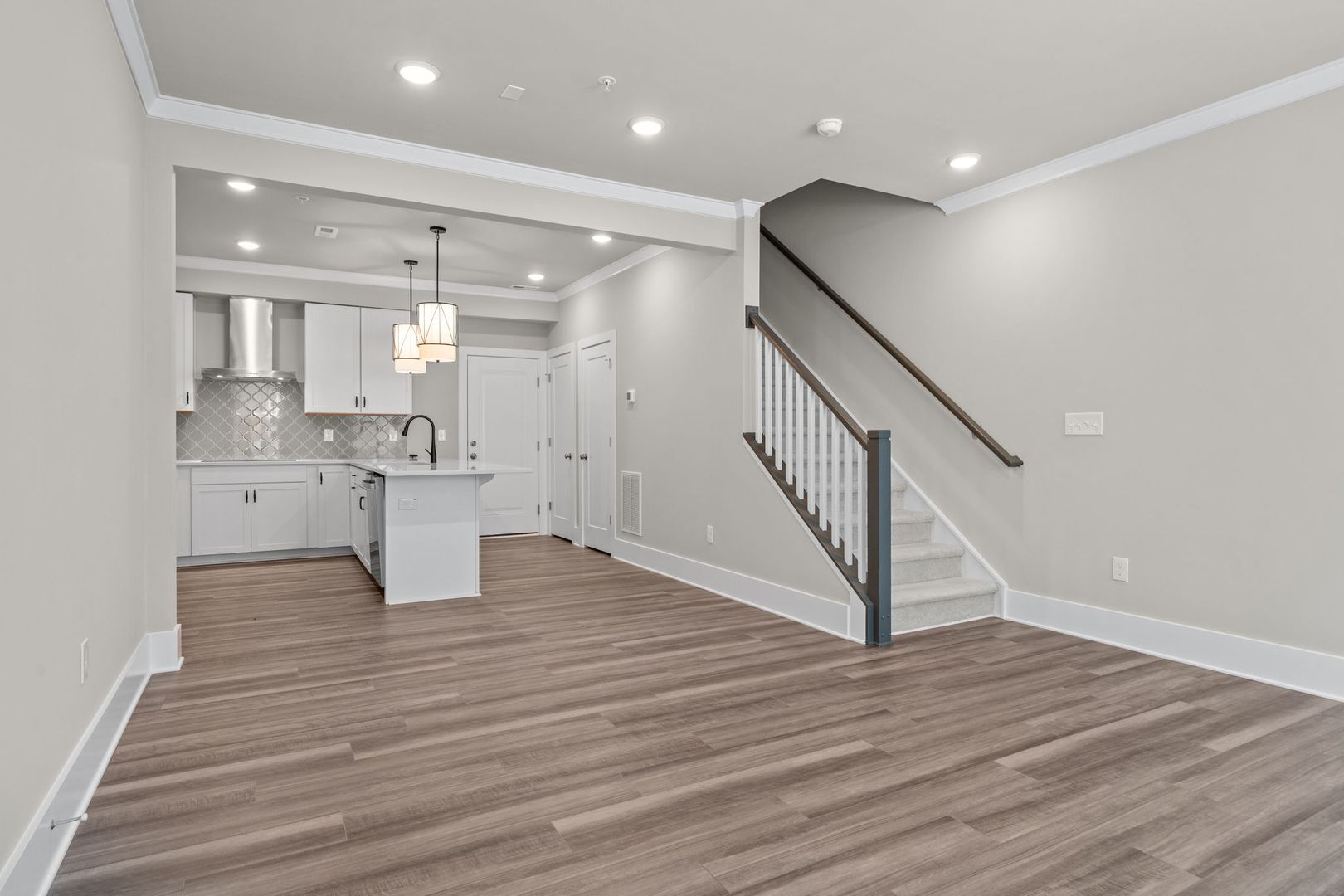 This beautiful home offers an open floorplan with a spacious living room and an updated kitchen with stainless steel appliances, stone countertops, pantry storage, and hardwood floors.