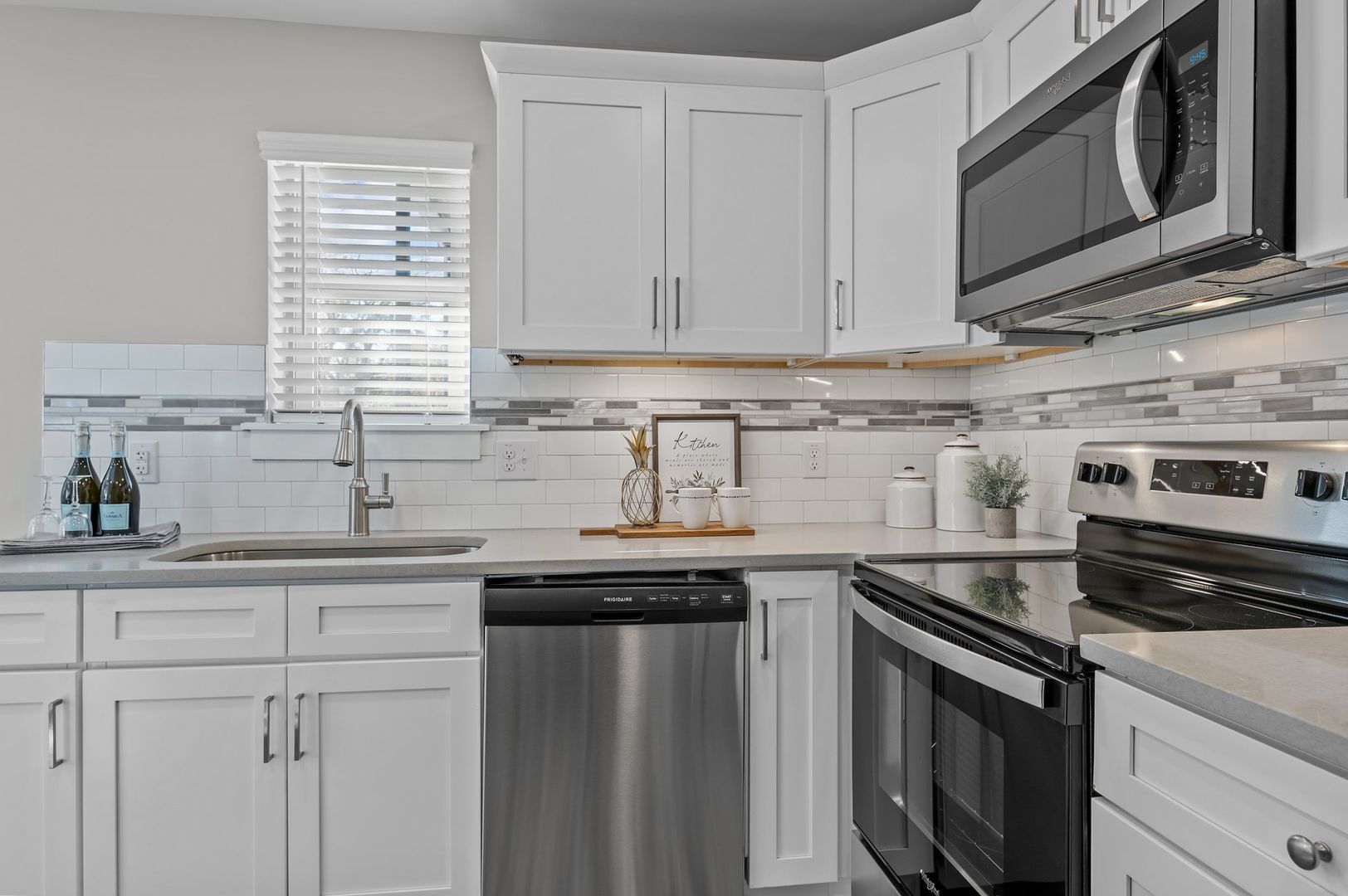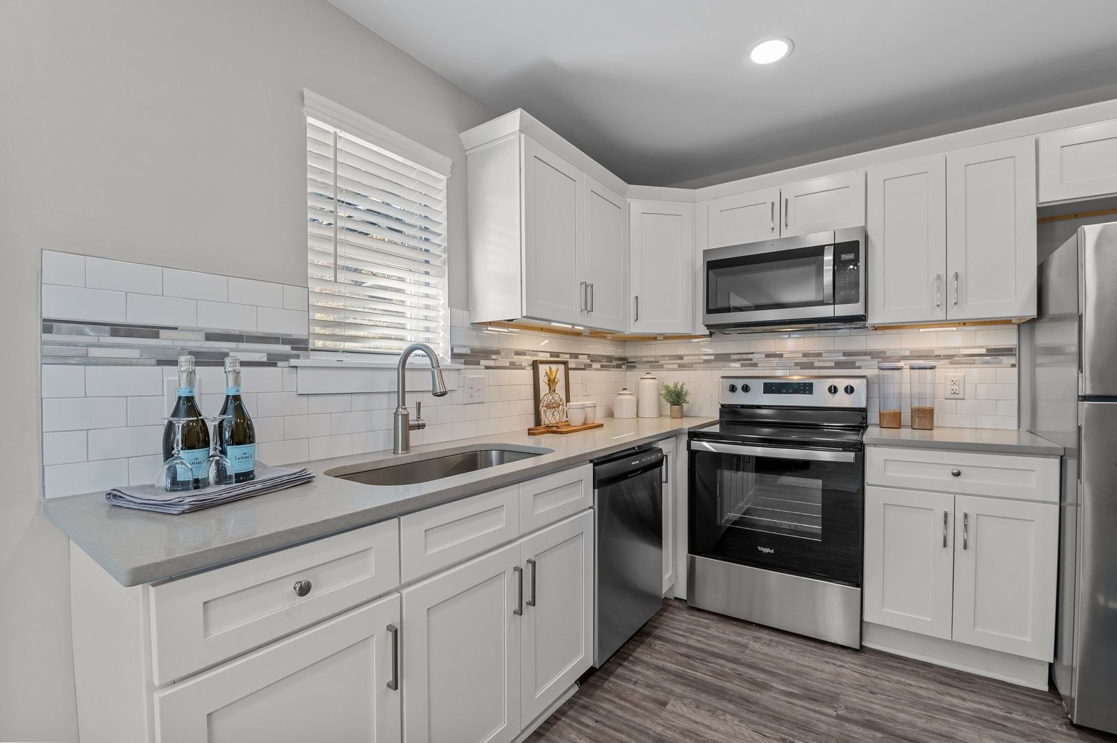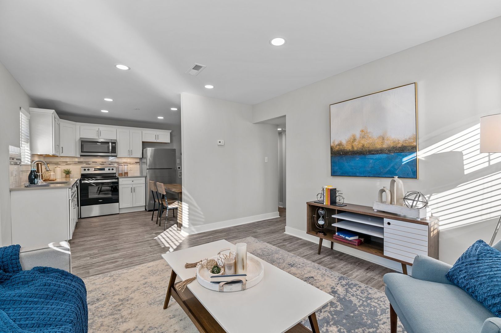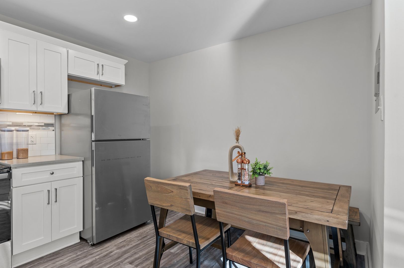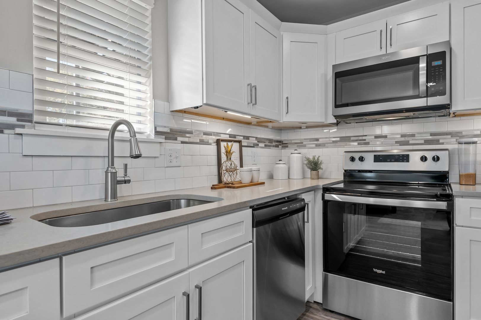 The custom kitchen features soft-close cabinetry, quartz countertops, and a beautiful tile backsplash, making it a chef's dream. Equipped with stainless steel appliances and undercabinet lighting, cooking and entertaining will be a breeze. Enjoy your meals in the spacious dining area, illuminated by updated lighting fixtures.