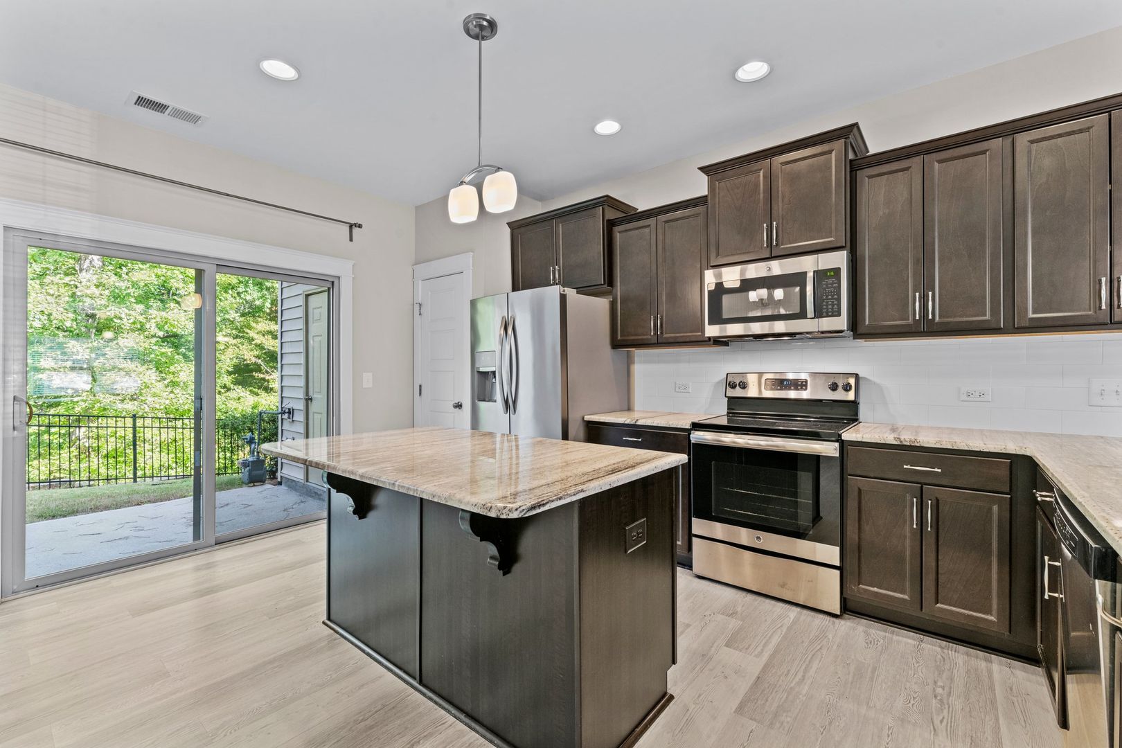 The rear window on each floor enjoys a picturesque view of the forest of pine trees. There is also a private patio off the kitchen, which also includes an outdoor storage closet.